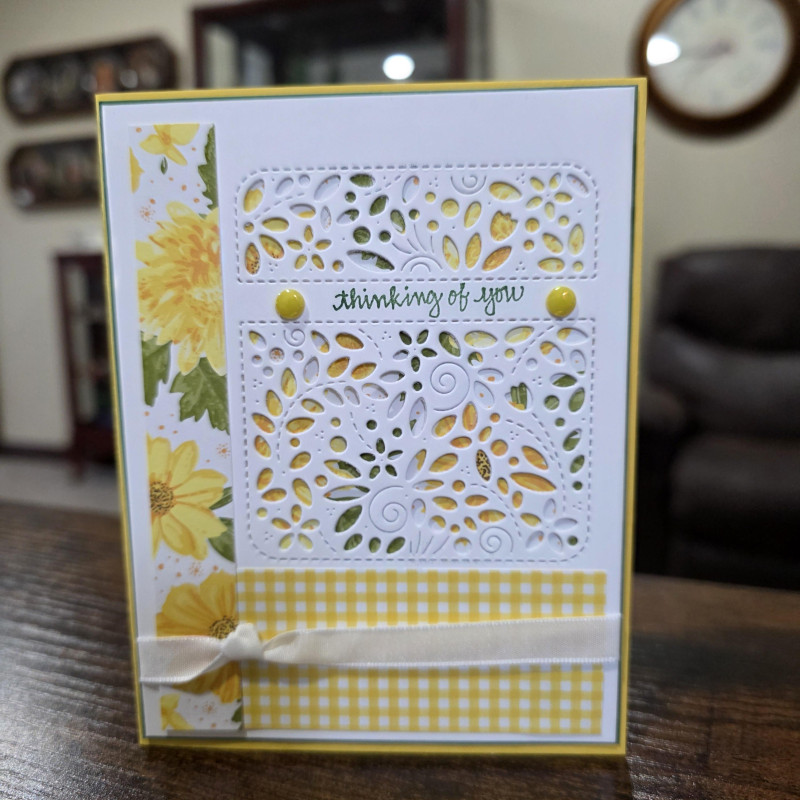 Accessories: Stampin' Up Brushed Brass Butterflies, Tasteful Labels Die, Mixed Florals Dies, Distressed Tile Embossing Folder, Linen Thread, Waffle Flower Nesting Circles Dies, Copics Markers